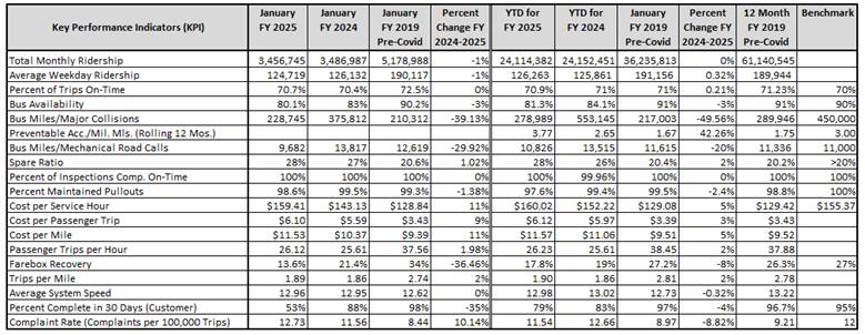 weekday ridership for the month of January 2025 is 124,719 down by 1,413 or -1%