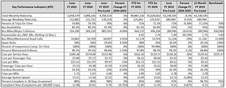 ridership for the month of June 2025 is 112,882 down by 2,840 or -2% from the previous year. Fiscal