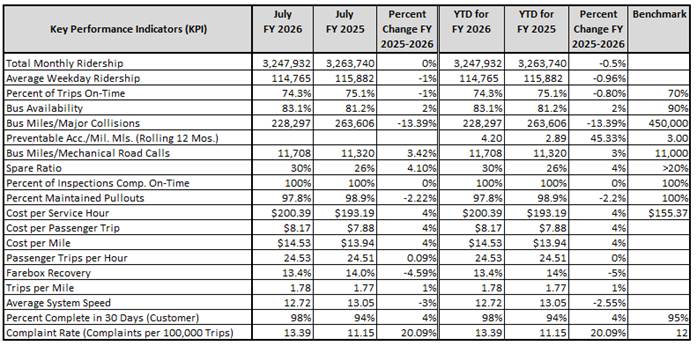 ridership for the month of July 2025 is 112,882 down by 1,117 or -1% from the previous year. Fiscal