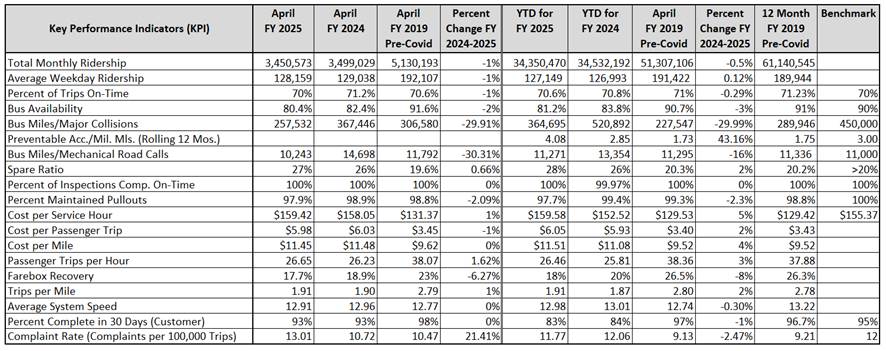 weekday ridership for the month of April 2025 is 128,159 down by 879 or -1% from the previous year.