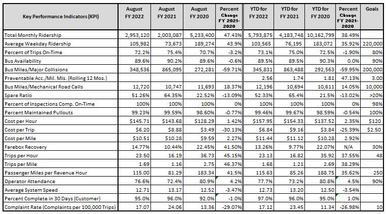 for the month of August 2021 were 105,982, up by or 44% from the previous year. Average weekday fixed-route boardings were up