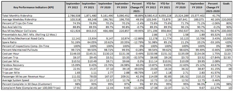 were 103,518, up by 34,270 or 49% from the previous year. Average weekday fixed-route boardings were down as compared to the previous month of August,